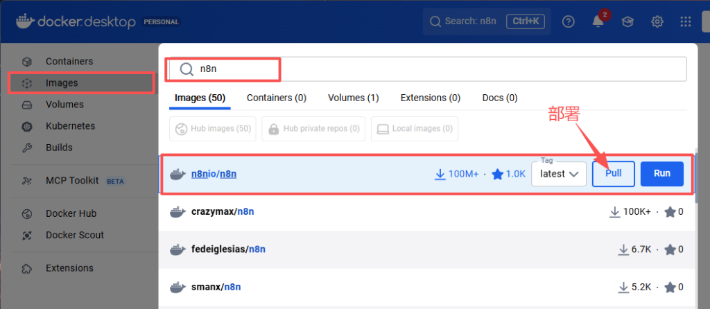 添加镜像(Images),搜索n8n(这里需要魔法上网),选择排行第一的“n8nio/n8n”,点击Pull下载镜像